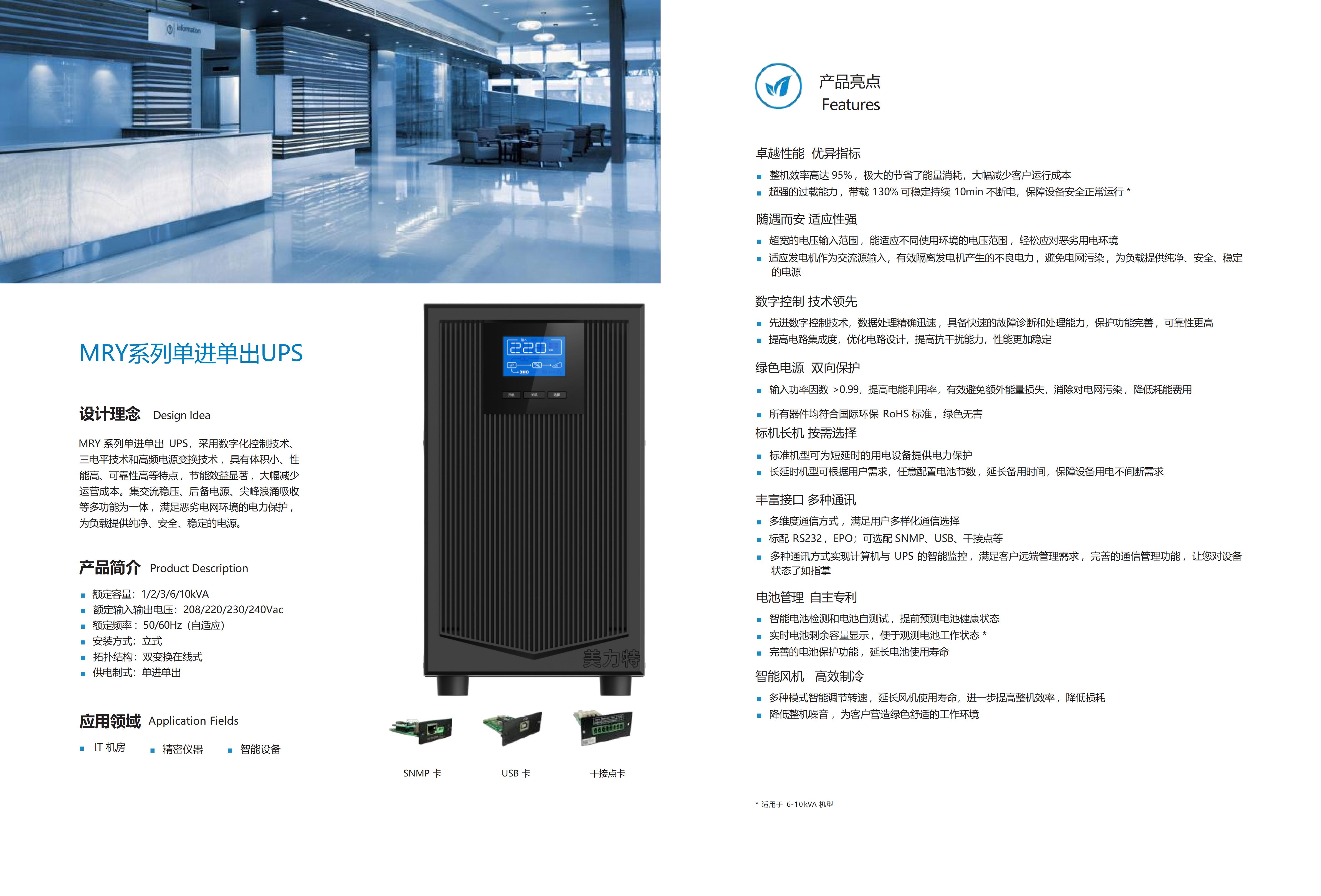 MRY11-系列 高频单进单出塔式UPS 美力特MRY11-系列 系列单进单出 UPS,采用全数字化控制技术和最新高频电源变换技术,具有高效率、高功率因数等特点,节能效益显著,大幅减少运营成本。集交流稳压、后备电源、尖峰浪涌吸收等多功能为一体,满足恶劣电网环境的电力保护,为负载提供纯净、安全、稳定的电源。 适用场景 IT 机房 小型智能设备 精密仪器